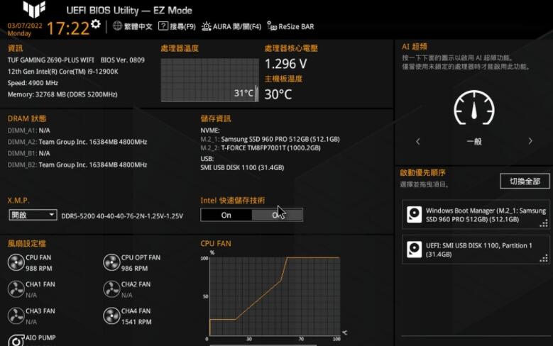 EZ MODE BIOS有着详细的电脑资讯从CPU、DRAM、SATA、M.2、FAN等装置信息,以及CPU温度与电压等数值,还有电脑主要开机排序等调整功能,让一般玩家能在一个界面中就搞定电脑的基本设定。