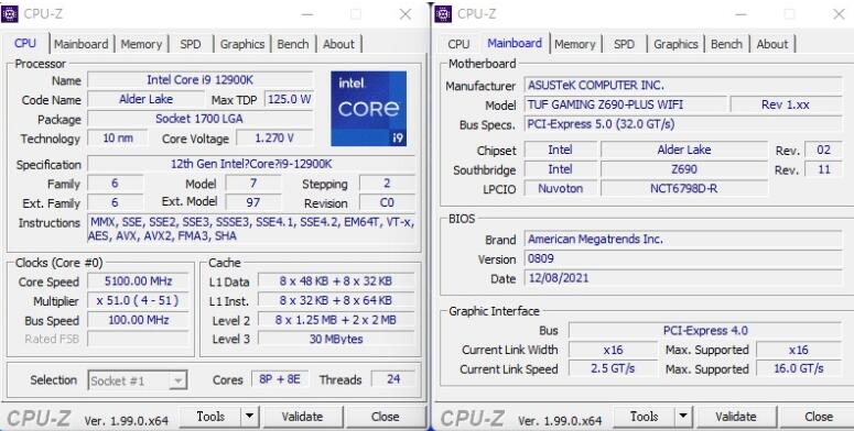 CPU-Z检视Intel Core i9-12900K处理器信息,代号Alder Lake的Intel 7 10nm制程8+8核心24线程处理器,搭配TUF GAMING Z690-PLUS WIFI主板测试,BIOS为0418,內存则是双通道DDR5 16GBx2 5200MHz。