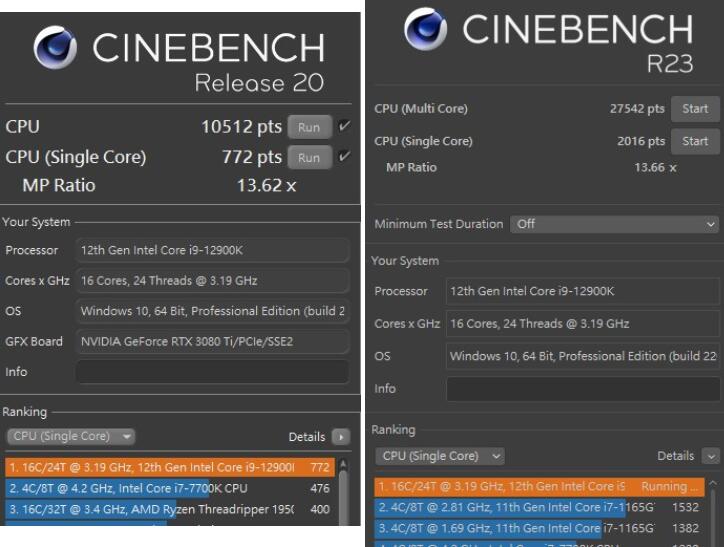 i9-12900K在R20版本测试可达到CPU 10512 cb的成绩,而R23版本亦有着CPU 27542 pts的成绩;单核性能则分别有着772 pts、2016 pts的性能。
