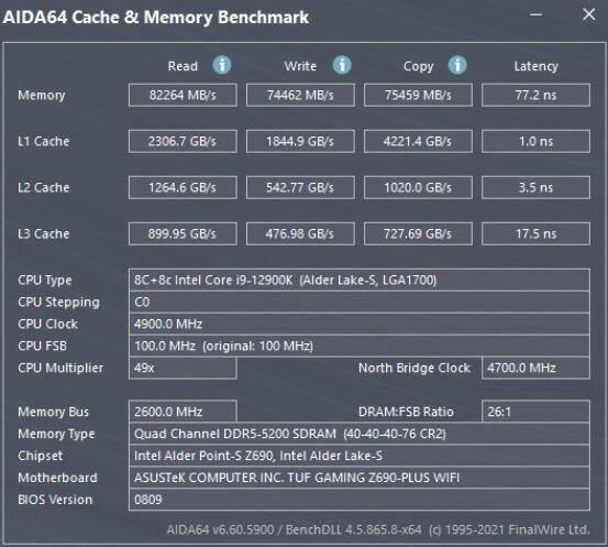 AIDA64內存与缓存测试,內存使用T-FORCE DELTA DDR5 2x16GB 5200MHz,搭配TUF GAMING Z690-PLUS WIFI有着內存读取82264 MB/s、写入74462 MB/s、复制75459 MB/s、延迟77.2 ns的表现。
