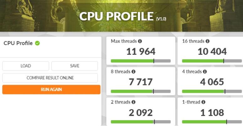 3DMark CPU Profile是针对处理器所设计的测试,主要测试CPU的物理运算与自定义模拟两种工作,并分别测试处理器的1、2、4、8、16与最大线程下的性能,之所以会有不同的线程测试,那是因为不同应用、游戏能效利用的线程数量不同。